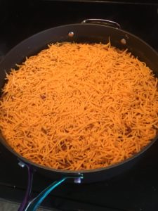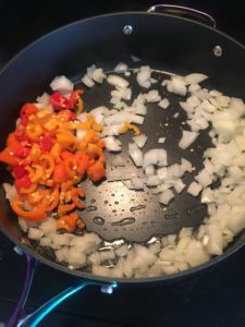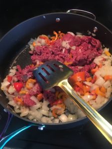スイートペッパー、ひき肉、ズッキーニを炒めます。