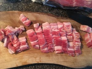 具材の茄子、ベーコン、人参を切ります。