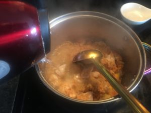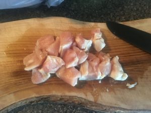 次に鶏肉を適当な大きさに切り、厚手の鍋で炒めます。